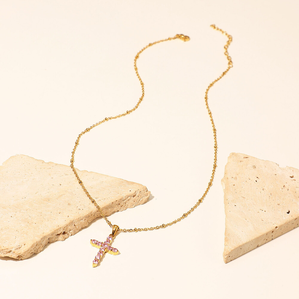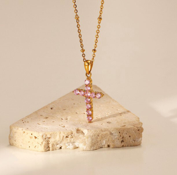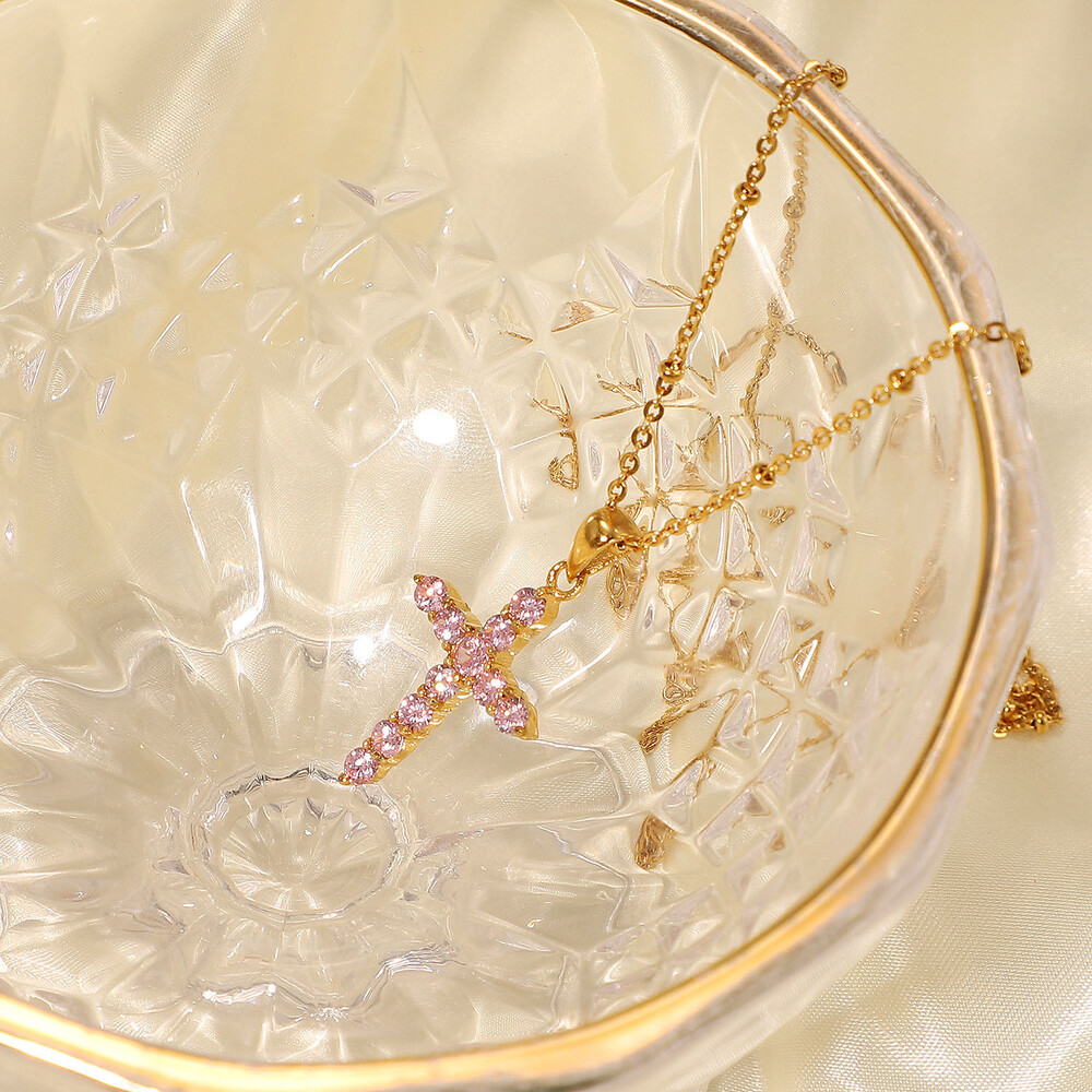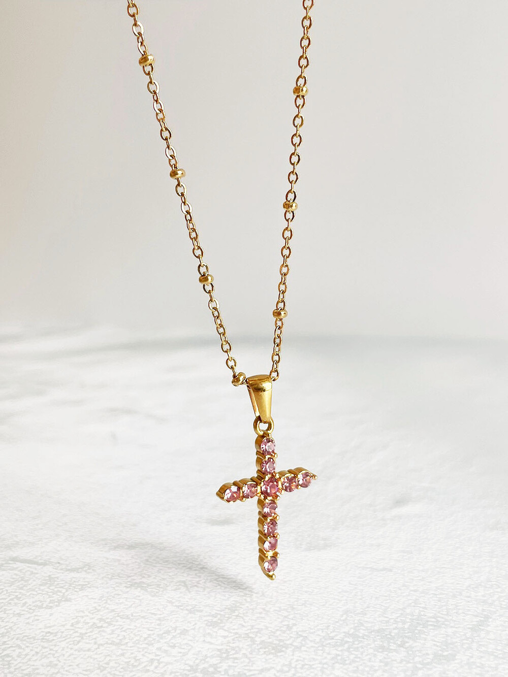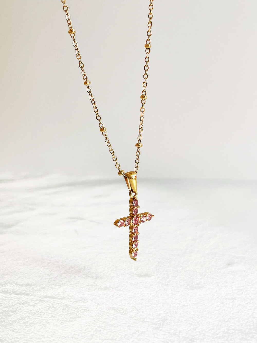 페미닌한 느낌의 핑크색이 돋보이는 십자가 펜던트 목걸이에요.