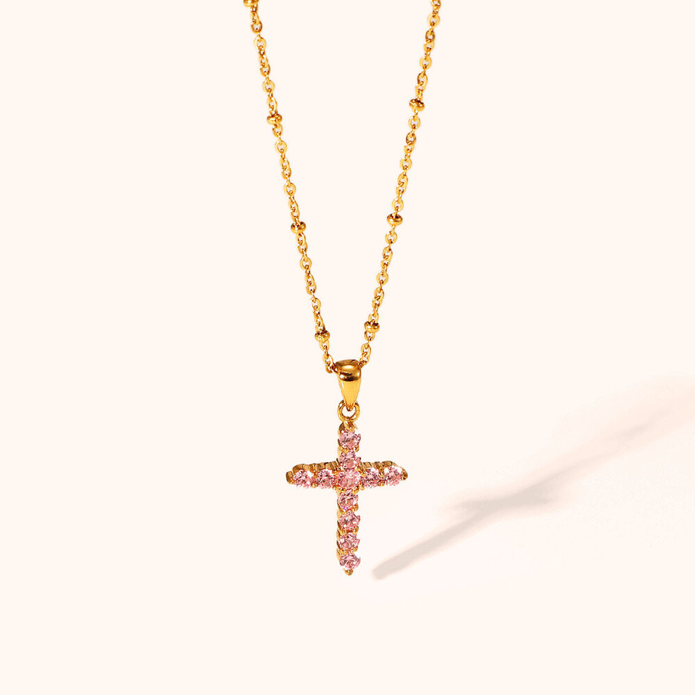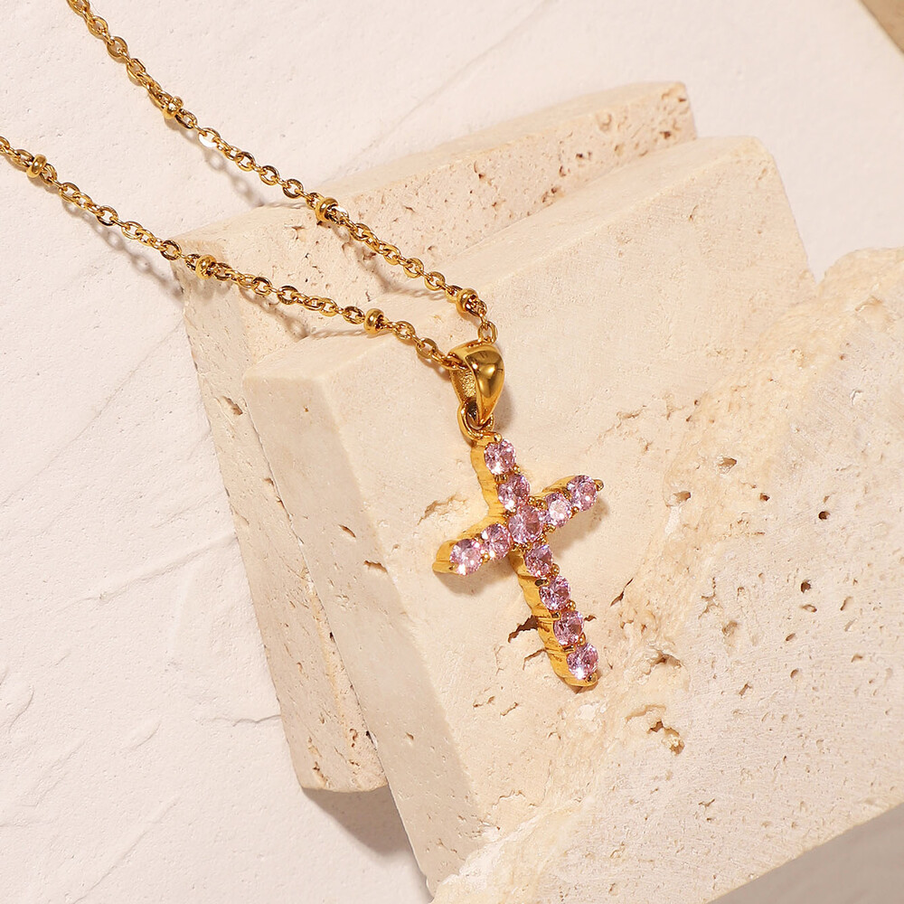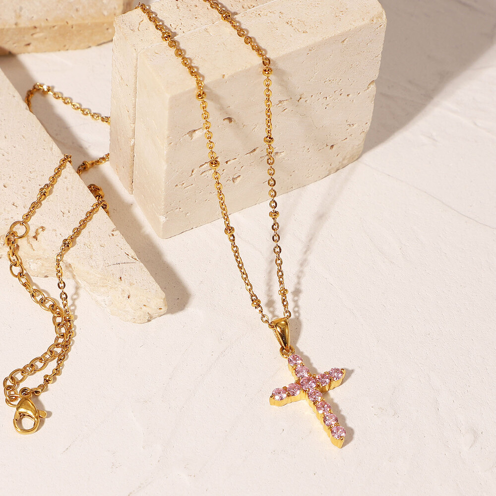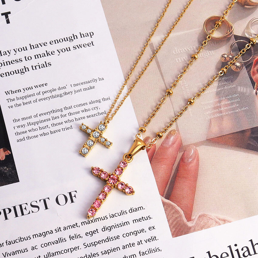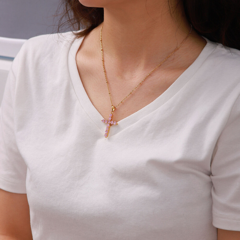 페미닌한 느낌의 핑크색이 돋보이는 십자가 펜던트 목걸이에요.