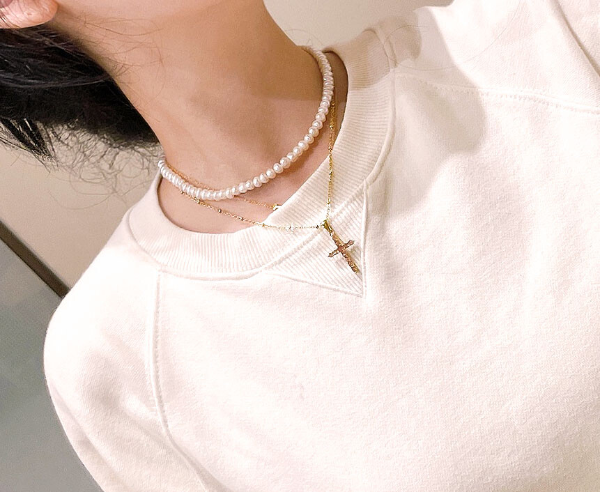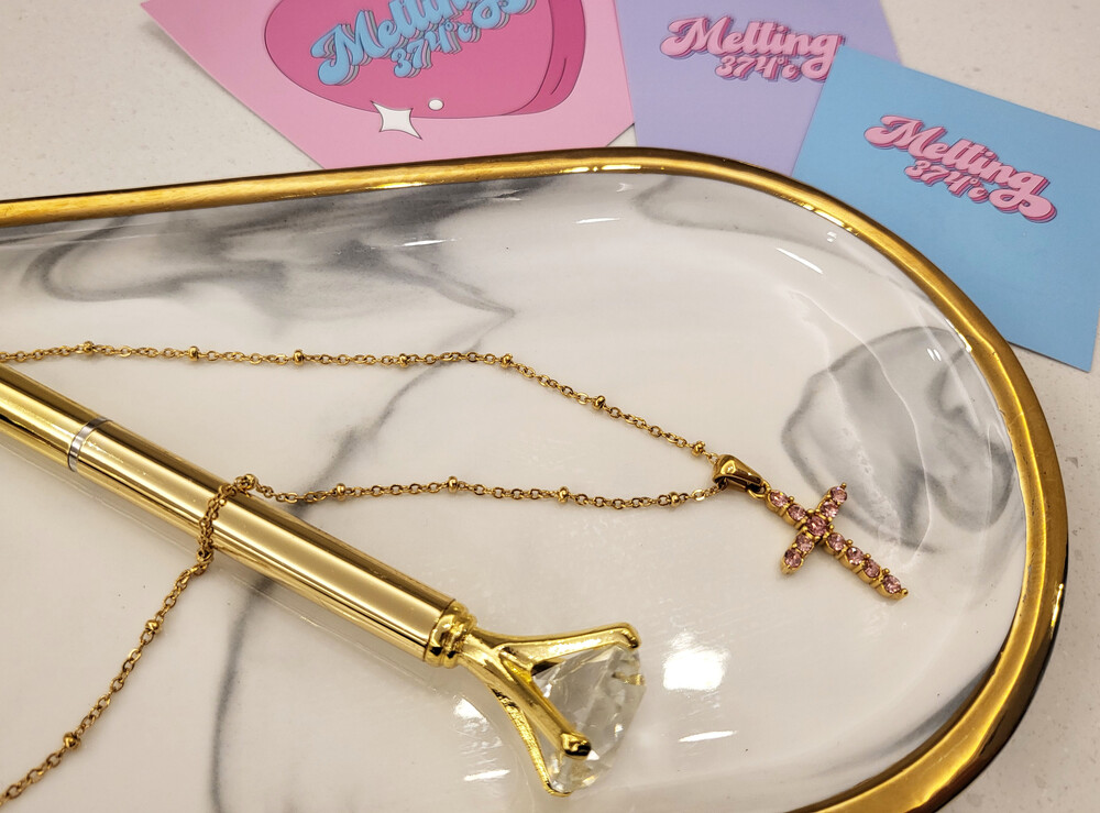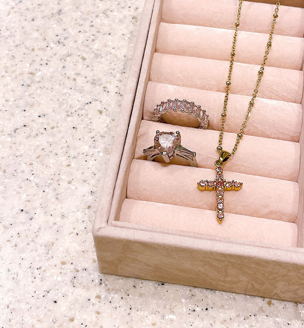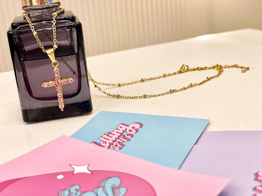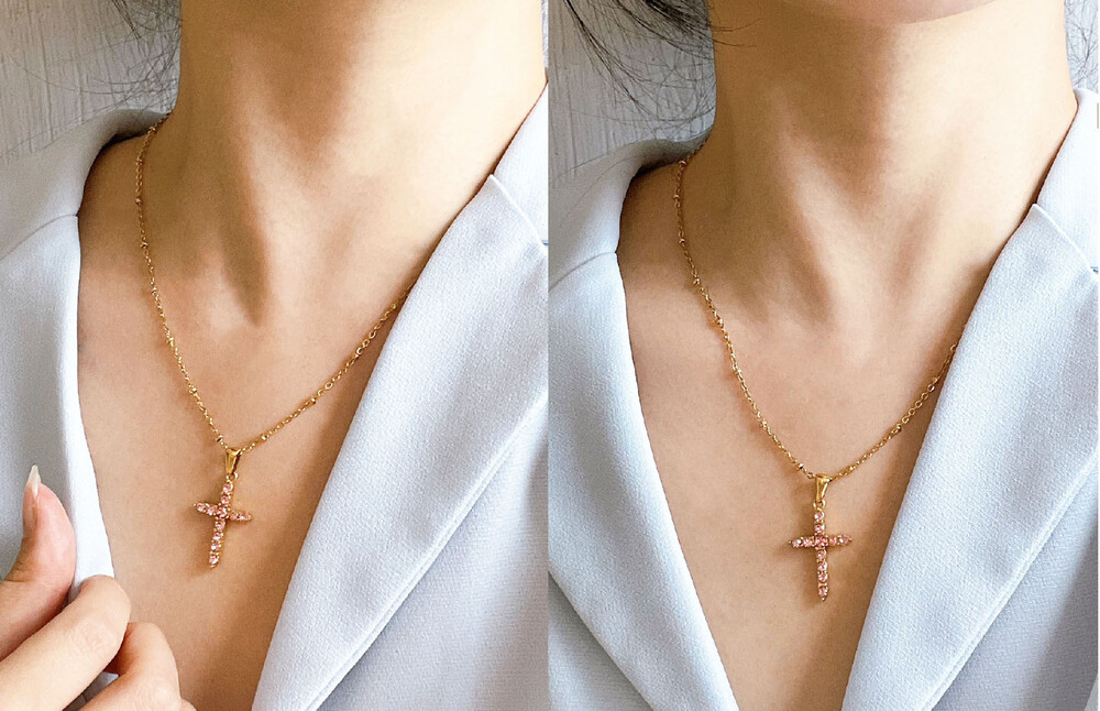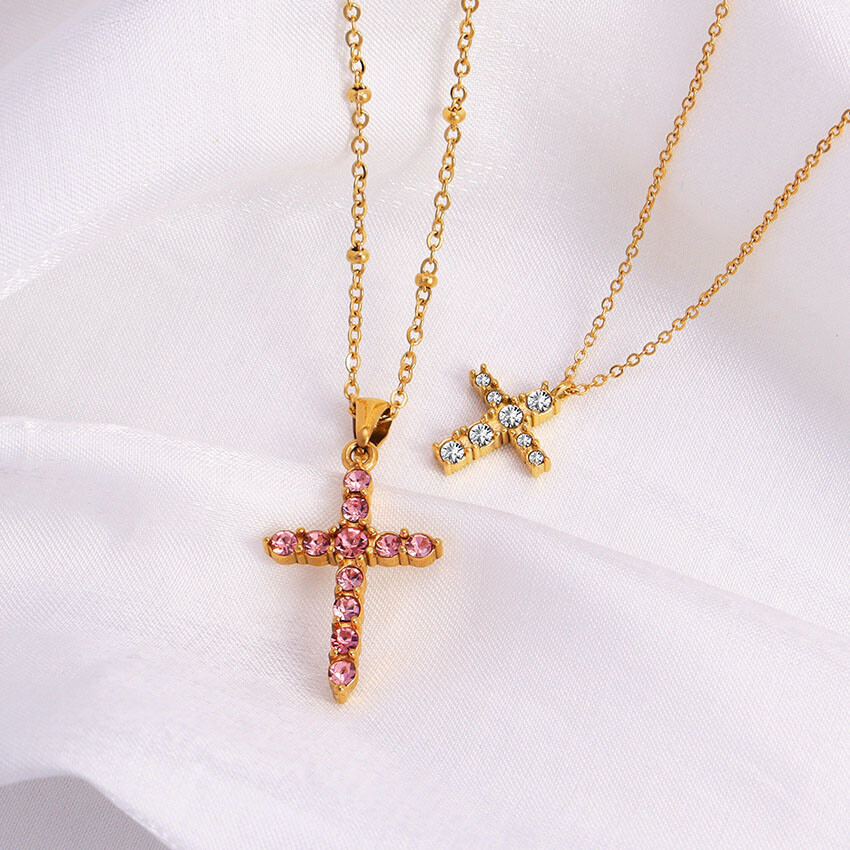 페미닌한 느낌의 핑크색이 돋보이는 십자가 펜던트 목걸이에요.